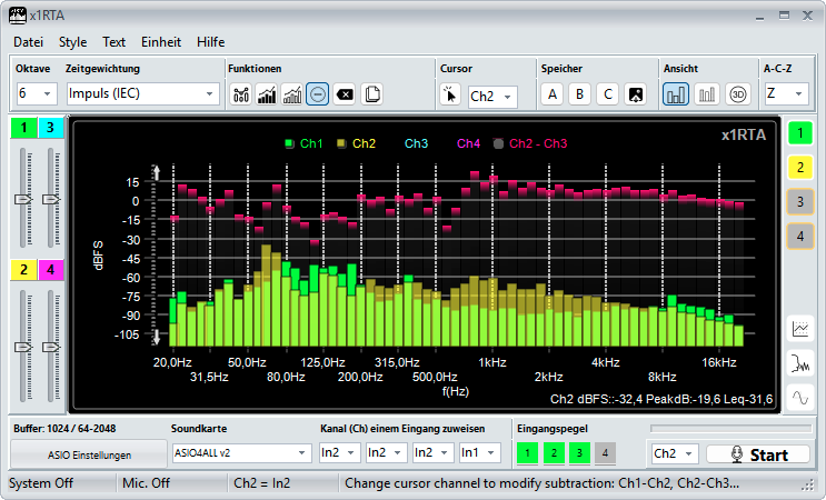 Für die Arbeit von Vergleichsmessungen, wie mit Sound Profilen, ist die Differenzmessung sehr hilfreich. Ein Kanal enthält die Vorgabe und der Zweite die aktuelle Messung. In Rot zeigt das RTA Modul die Differenz.