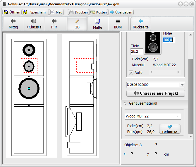 Nun noch die Außenmaße der Box setzen und die Lautsprecher auf der Front- oder Rückseite mit der Maus platzieren.
