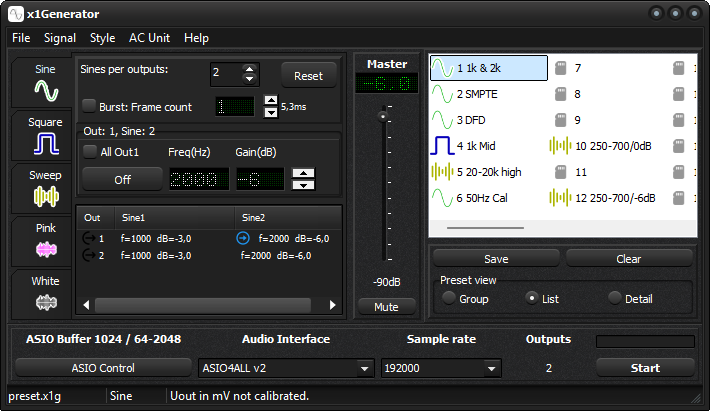 Mit der x1Generator Software erzeugen Sie unkompliziert viele Signale zur Analyse Ihres Audio Equipments. Darunter sind auch Multi-Sinus Signale zur nichtharmonischen Verzerrungsmessung (z.B. SMPTE) wie auch Rechteck, Sweep und Rauschen.