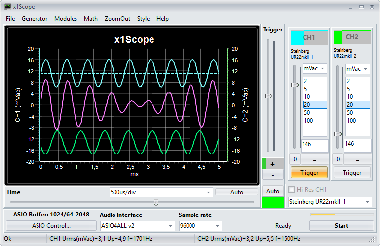 x1Scope is a high-resolution oscilloscope. Voltages are resolved very finely with up to 32 bits.