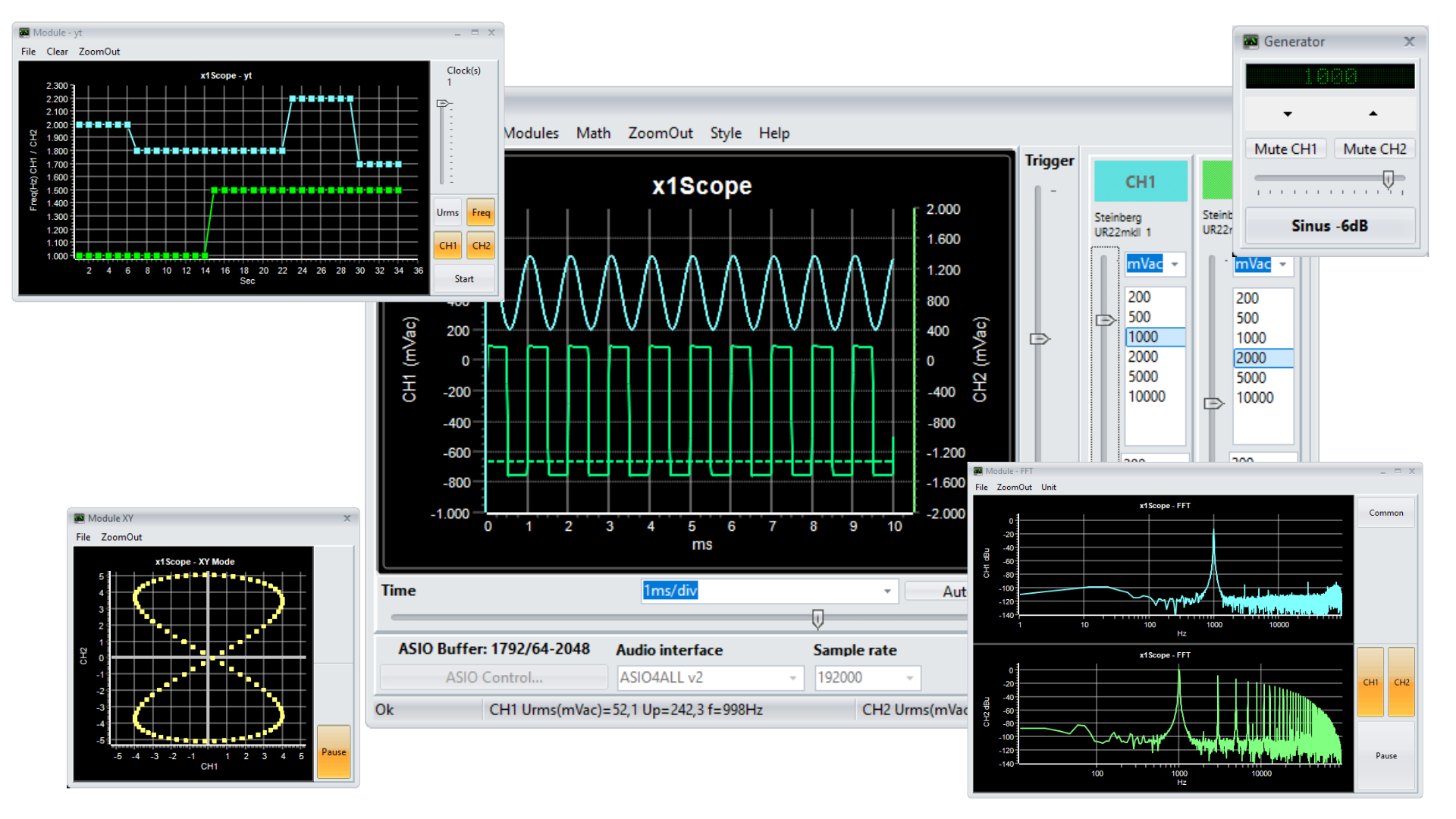 In the XY module, both input signals are projected onto the X and Y axes. The resulting figures (Lissajous) provide information about the phase and frequency ratio of channel 1 to channel 2.